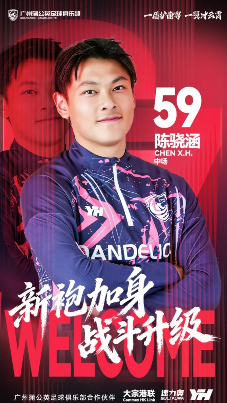 盾护南粤,翼冲云霄。2026赛季陈骁涵将身穿广州蒲公英战袍出征各项赛事,期待他未来为广州球迷带来更多精彩表现,与广州蒲公英一同书写更多新篇章!